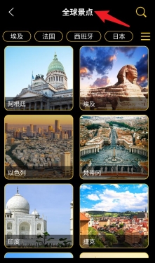 5进入“全球景点”页面后,能浏览全球各地知名景点,并且提供按国家分类筛选以及通过关键词查找的功能。