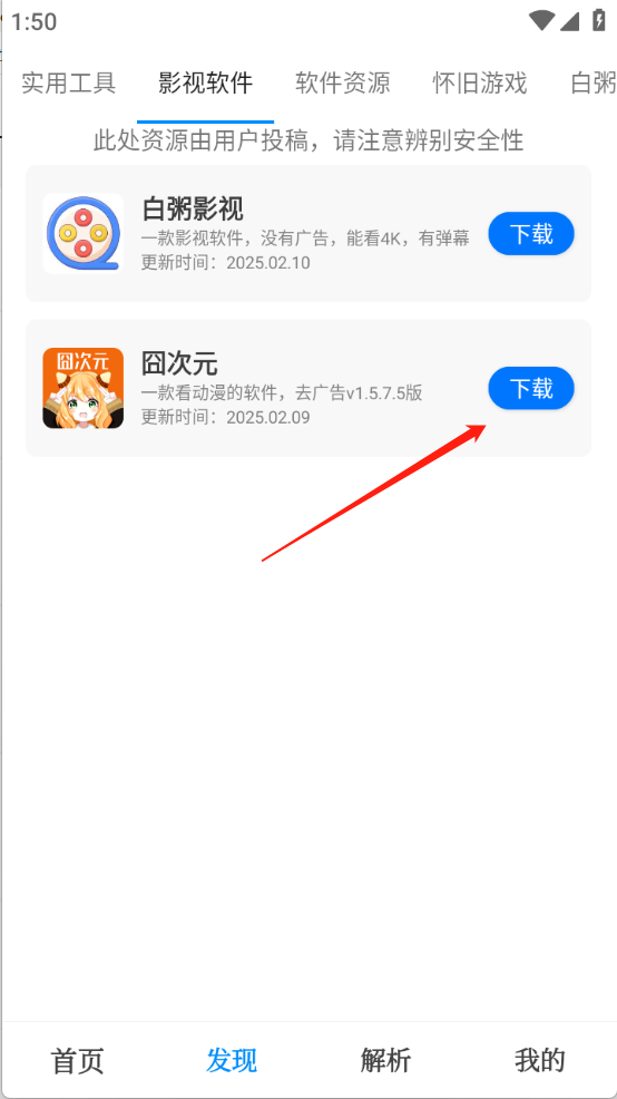2、进入“发现”页面后,这里汇集了丰富多样的软件资源,涵盖影视类、小说类、音乐类等多种类别。