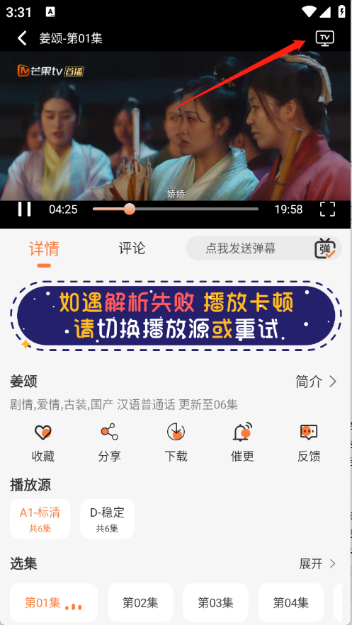 1、挑选好想看的影视资源后,点击右上角的“TV”按钮。