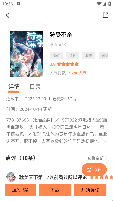 4、点开想看的漫画进入详情页,可以将漫画加入书架、以及开始阅读。