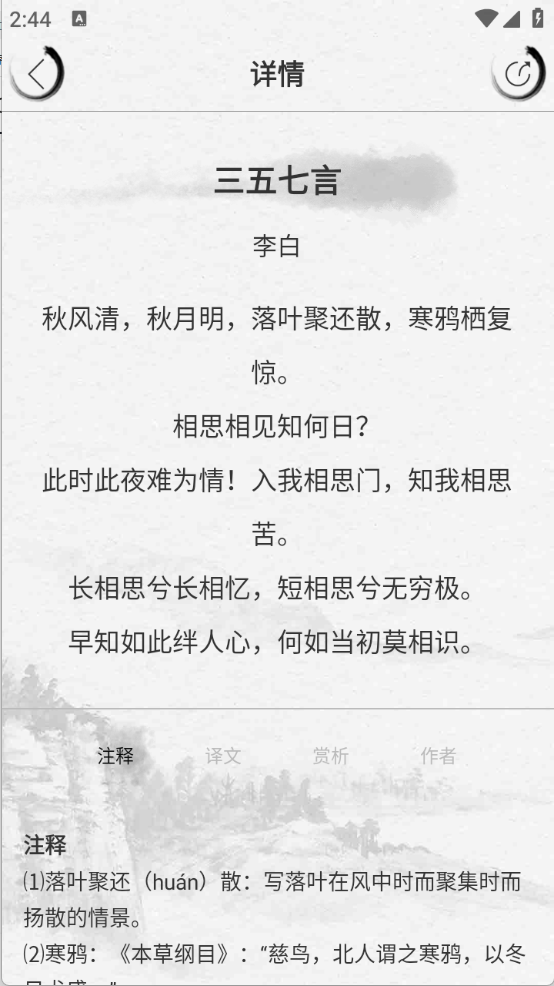 6、点开想要学习的诗词,有详细的注释、疑问以及赏析等。