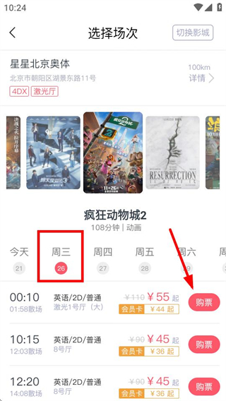 1在影片展示界面,找到你想观看的影片对应的预售入口并点击,随后会跳转至场次挑选页面。