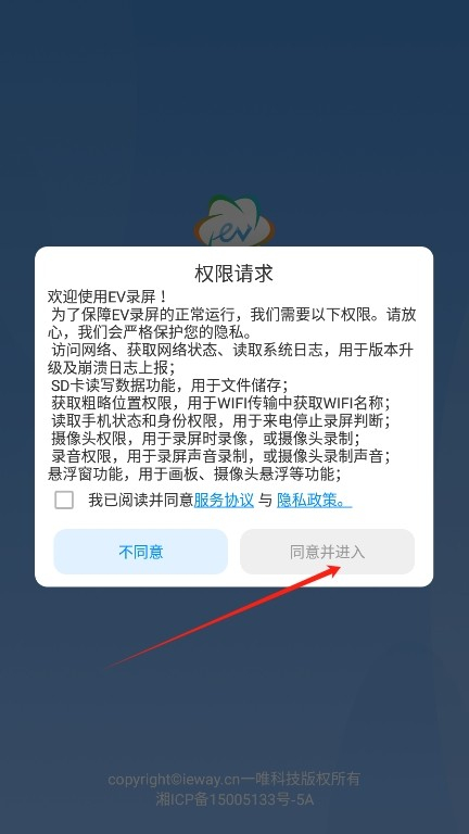 2、进入后阅读并同意ev录屏的用户协议