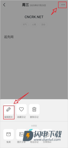 2、另外,你也能直接打开已有的日记,点击右上角的三个横点图标,在底部弹出的选项里找到“编辑图文”。