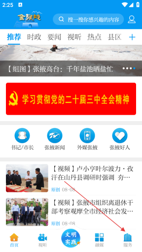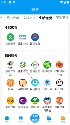 1、打开【金张掖】首页,点击底部的【服务】选项,即可进入服务界面。