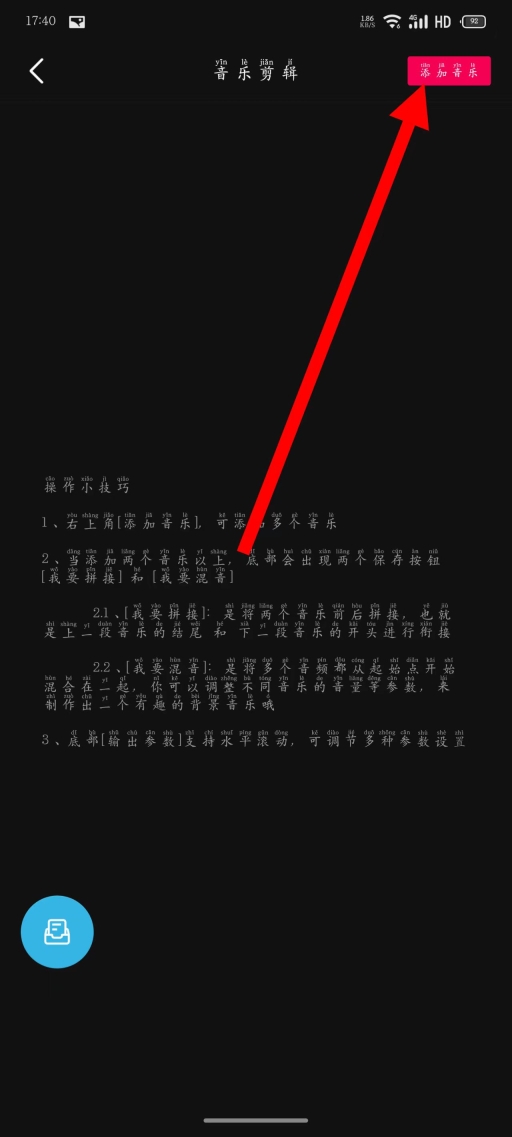 2、进入音乐剪辑页面后,点击右上角添加音乐。