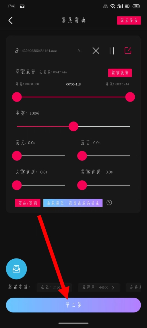 4对音乐的时长、音量以及淡入淡出效果等相关参数进行设置,待所有参数调整完毕后,点击“下一步”按钮继续操作。