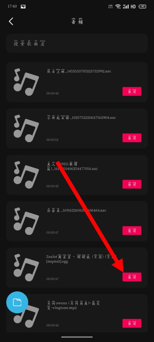 3、选择你想要剪辑的音乐,点击其右侧的使用按钮。