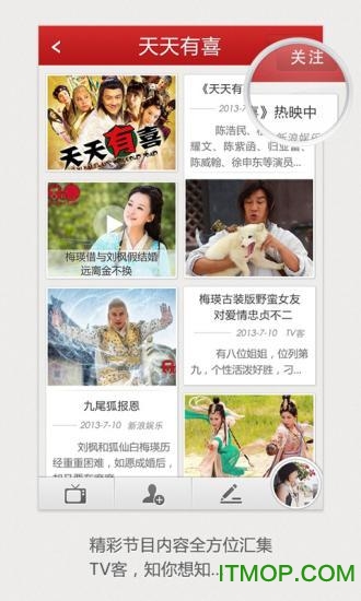 TV客 全新版本重磅上线涂鸦电视功能,为用户打造即时、轻松、趣味十足的互动吐槽空间,让大家能在看到内容的第一时间畅快表达。只需对正在播放的电视画面实时截屏,就能自由绘制图文、添加各类创意道具,通过简单DIY传递个人想法。无论是圈出节目里的穿帮镜头,还是恶搞剧中人物与情节,或是配上个性诙谐的批注,完成后一键就能分享到微博、朋友圈,和好友们较量下谁的电视涂鸦更具创意亮点。