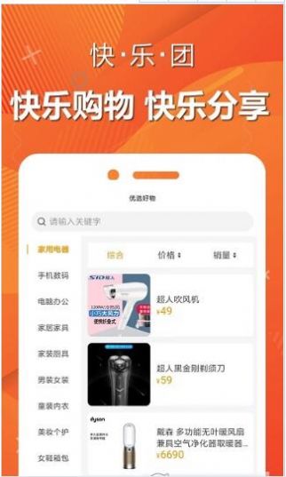 这是一款名为快乐团购的商城购物应用,用户能在手机上便捷选购各类心仪商品,随时下单满足自身所需。平台提供丰富的折扣商品,人人皆可使用,无需门槛,轻松就能以实惠的价格买到众多优质好物,通过手机随时下单,省钱变得简单,因为这里汇聚了大量低价优质产品。