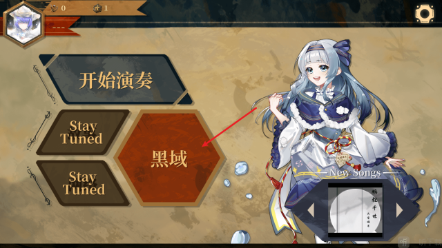 1. 游戏里解锁歌曲的途径有两种,第一种是点击主界面上的黑域区域。