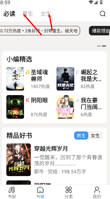 2在书城页面的分类区域,设有专为不同读者群体划分的“男生”“女生”专属板块。点击相应板块后,系统会自动筛选出符合该群体偏好题材的书籍。其中,男生板块主要包含玄幻修仙、都市爽文等类型,女生板块则涵盖言情穿越、古言宫斗等题材。