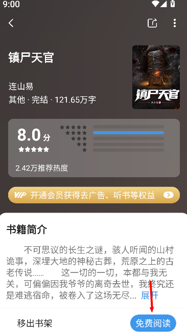 3在经过筛选的书籍集合里,你可以借助封面、书名或者内容简介来选定想要阅读的书籍。点击该书的封面就能进入其详情页面,在这个页面的显眼处找到标有“免费阅读”的按钮并点击,这样就能直接跳转到阅读界面,开始你的阅读之旅了。
