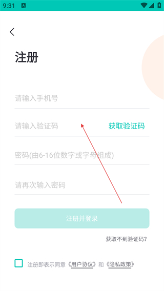 4、按顺序输入手机号与验证码,接着设置密码,随后勾选相关协议并点击【注册并登录】按钮,即可完成新用户的注册流程。