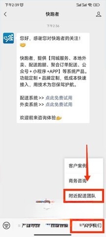 3、启动微信应用,在搜索栏输入“快跑者”找到对应的公众号并完成关注操作,进入该公众号界面后,找到“关于我们”板块进行查看,随后点击其中的“附近配送团队”选项。