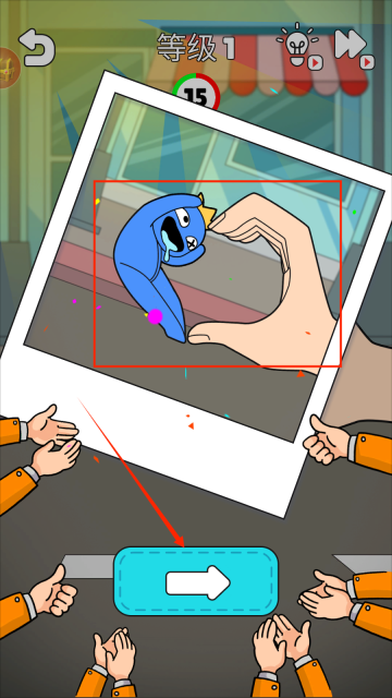 2、当调整后的姿势能与关卡画面比出爱心后,把怪物拖拽到图框里,完成合影留念就能闯关成功,进入下一关。