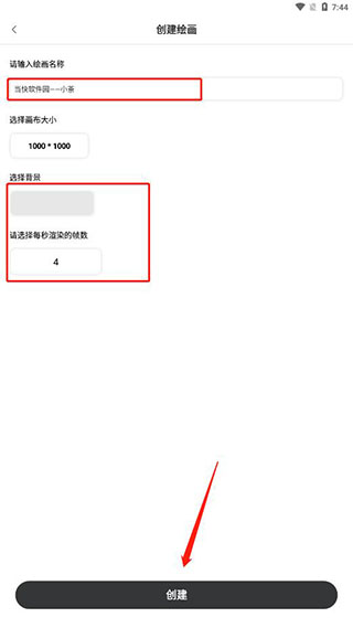 3、输入绘画的名称,选择画布尺寸、背景以及每秒渲染的帧数,随后点击创建按钮。