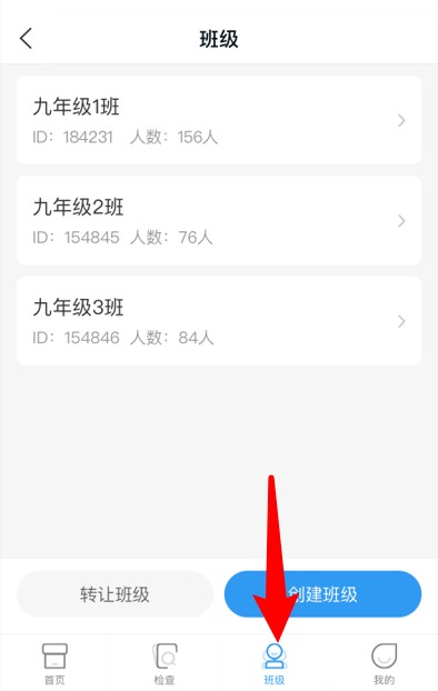 4、点击底部的“班级”按钮,即可查看自己所在的年级以及班级列表,同时还能进行班级的创建操作或班级权限的转让操作。