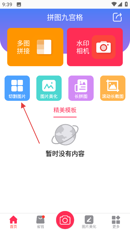 1这个拼图九宫格软件的首页包含多图拼接、水印相机等诸多功能,若你需要切割图片,只需点击切割图片按钮进入对应功能页面,即可便捷地对图片进行切割操作。