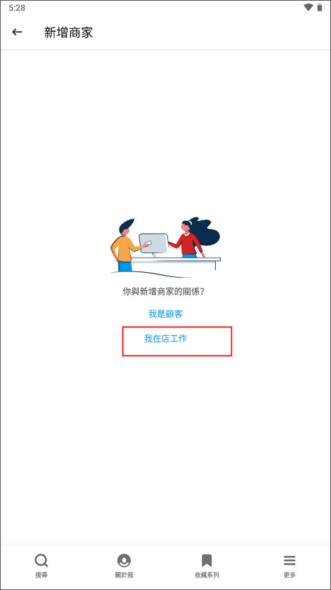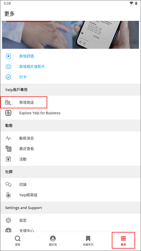 1首次进入时默认显示“搜寻”板块,需点击切换至【更多】页面,在Yelp商户专用分类下找到“新增商店”选项。