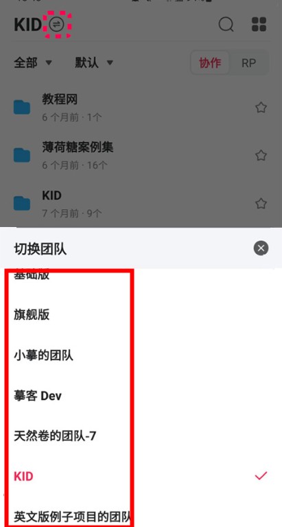 点击顶部团队名称旁的按钮,选择其他团队进行切换。