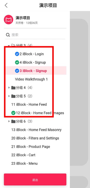 演示时长按屏幕,左侧弹出项目树,可快速切换页面。