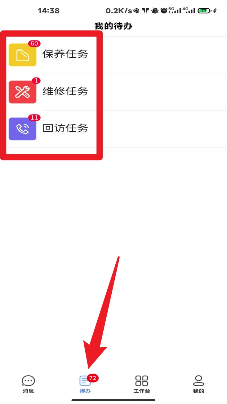 3切换到“待办”页面后,能查看保养、维修和回访这三类任务,按照提示点击就能进入具体的处理流程。