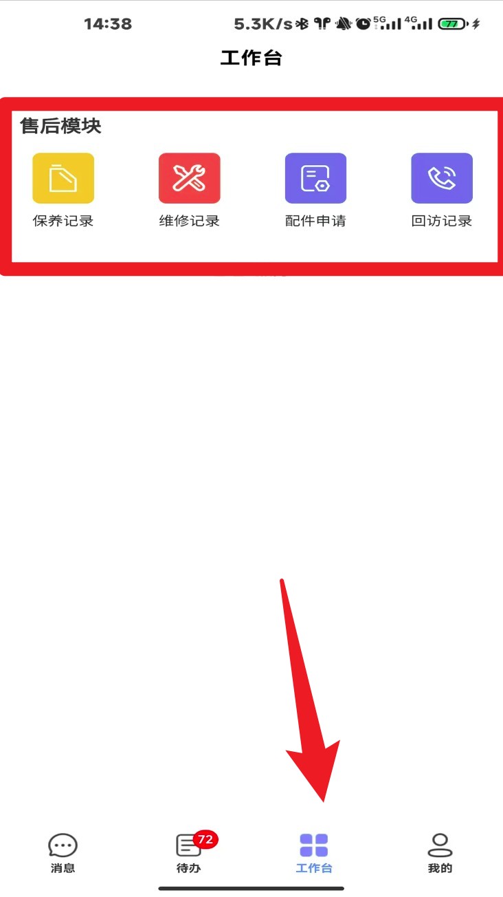 4. 点击底部的“工作台”图标,进入售后模块页面,就能查看并提交保养记录、配件申请以及维修数据。