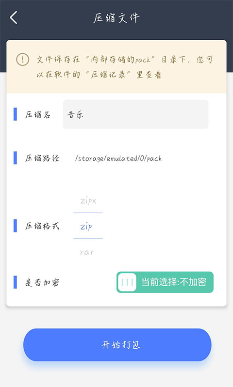 4、填写压缩文件名、选择压缩类型并决定是否加密,点击“开始打包”按钮即可完成操作。