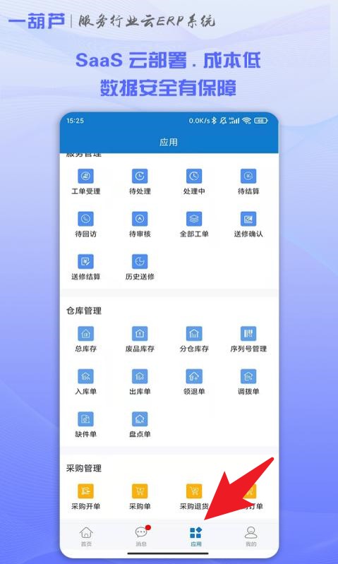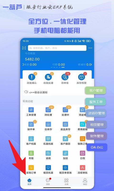 4、通过“应用”标签页能够进入采购开单、租赁管理、库存管理等更多后台操作模块。