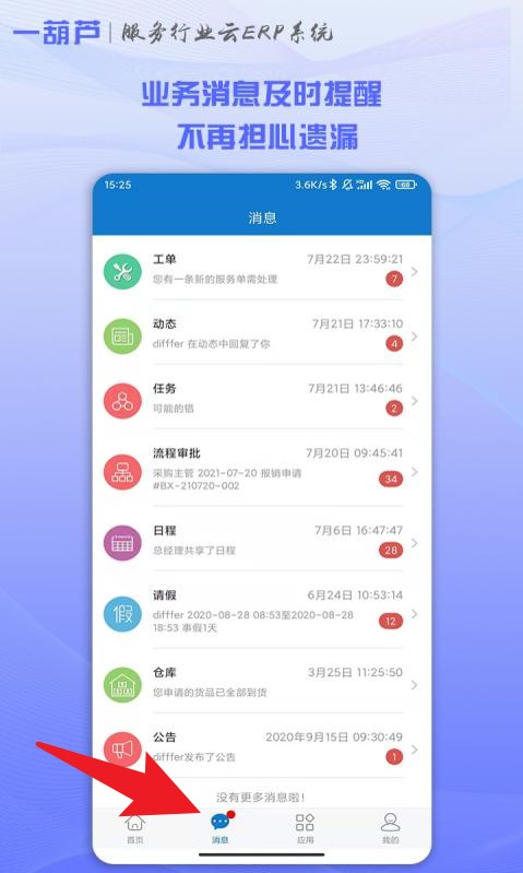 3点击页面底部的“消息”图标,能够查看工单、任务、流程审批等各类最新提醒,确保不会遗漏重要信息。