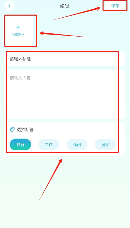 2、接下来,从相册中选择合适的照片添加进去,在相应位置填写记录的标题和详细内容,然后添加相关标签,全部设置完成后点击右上角的保存按钮。