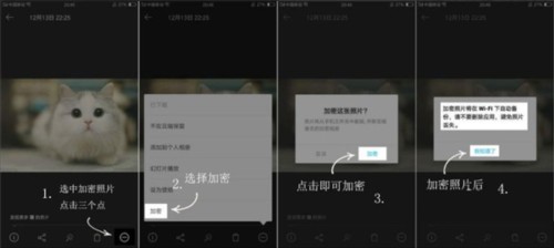 进入时光相册应用后,找到照片库入口,选中其中某一张照片,点击界面右下角带三个点标识的菜单按钮,最后选择加密选项即可完成操作。