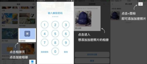 2、挑选已创建好的加密相册,点击进入后,找到并点击蓝色的+号按钮,即可向该相册添加加密照片。