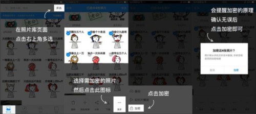 打开时光相册,进入照片库,选择多选模式,勾选需要的照片,点击更多选项,最后选择加密功能。
