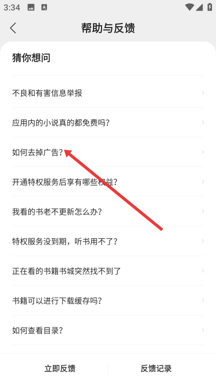 3在帮助与反馈页面,找到并点击“怎样关闭广告?”这个问题,就能进入该问题的详细说明界面。