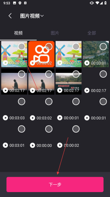 2、进入视频选择界面后,先选择需要剪辑的视频,接着点击“下一步”按钮,即可进入视频编辑界面。