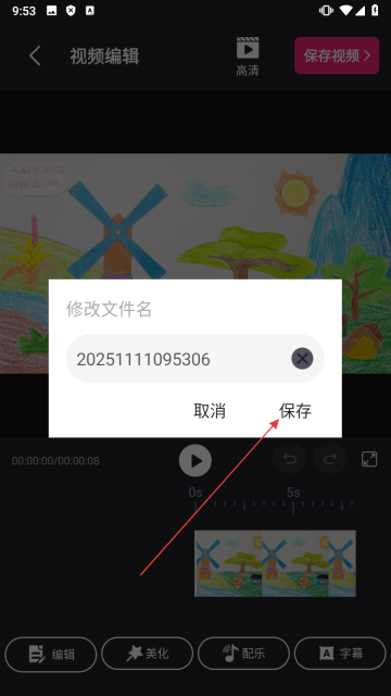 4当弹出修改文件名的提示窗口后,点击其中的【保存】按钮,就能结束整个剪辑流程了。