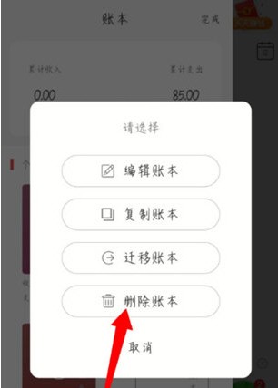 4、弹出的操作菜单中,选择“删除账本”选项。