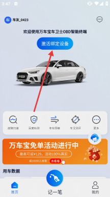 2进入主页面后,找到并点击“激活绑定设备”选项,页面会跳转至车辆添加界面,随即开始设备绑定的操作流程。