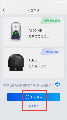 3、在【添加车辆】页面,可选择【扫码激活】或【手动输入】这两种设备绑定方式。