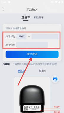 4、手动输入环节,需填写【序列号】与【激活码】,随后点击【绑定激活】按钮,即可完成万车宝设备的绑定操作。