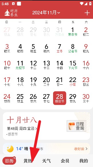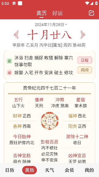 2、进入黄历页面,这里有当天的运势和黄历。