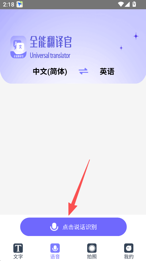 2、进入语音翻译模式后,点击语音识别按钮,通过说话输入内容即可完成翻译。