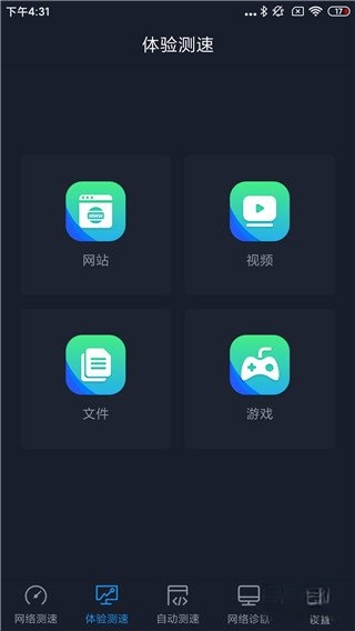 3测速功能包含网站、视频、文件、游戏四个不同的部分,用户能够依据自己的喜好来选择对应的测速项目进行体验。