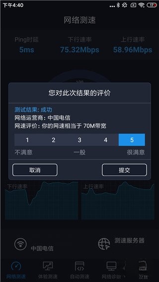 2、测速完成后,系统会弹出用于评价本次结果的弹窗,并给出类似“网速相当于100M带宽”的相关评价,为用户提供直观的参考依据。