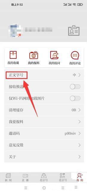 2、在“我的”界面中,选择“正文字号”栏目。