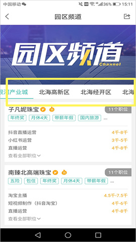 进入【园区频道】页面,选择对应的园区,就能便捷切换并找到心仪的职位。