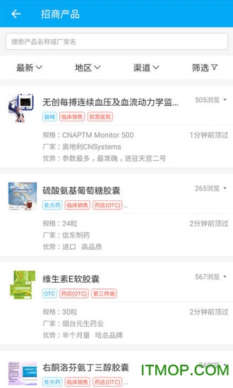 2.产品: 通过精细化的区域定位进行展示,涵盖上万家药企的产品信息,同时具备强大的移动智能匹配搜索功能。