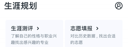 我们首先需要打开软件,接着点击底部中间位置的【生涯规划】选项,进入后就能看到顶部有【生涯测评】和【志愿填报】两个功能入口,大家可以直接在此处进行志愿填报操作。